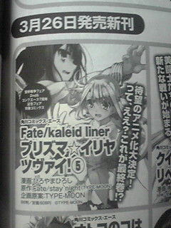 Аниме по манге Fate/Kaleid Liner Prisma Illya2012-03-11 13:43 MSKновостианиме По данным из рекламы на 228 странице журнала COMPTIQ, по манге Хироси Хирояма (Hiroshi Hiroyama) Fate/Kaleid Liner Prisma Illya будет сделано аниме.Via ANN