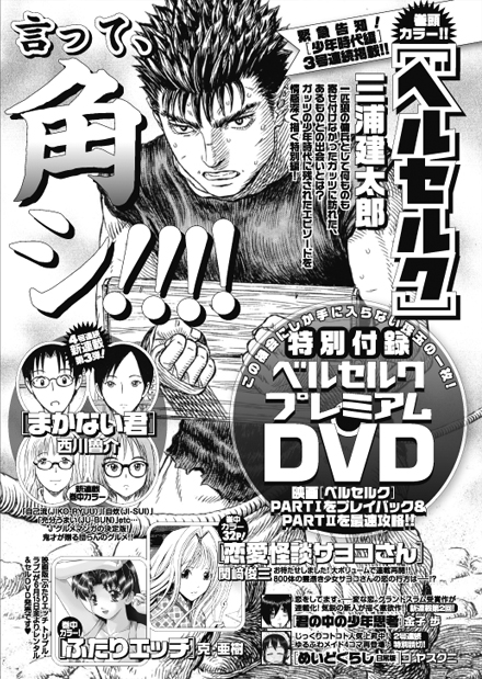 В 11 номере журнала Young Animal сообщили, что манга Миура Кэнтаро (Miura Kentarou) Berserk вернется с тремя новыми главами, начиная со следующего номера журнала 8 июня. Три главы расскажут о детстве Гатса (Guts).